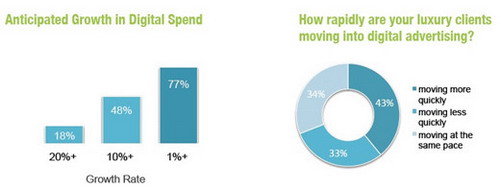 在數(shù)字媒體營銷投入上,有20%的接受調(diào)查的營銷者認(rèn)為,從2011年到2012年在數(shù)字營銷的投入增長將超過18%,更有1%以上的營銷者認(rèn)為這個增長速度將超過77%。上方右側(cè)圖也反映了營銷者在奢侈品數(shù)字營銷上的積極投入。