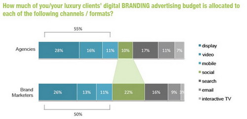 在數(shù)字媒體選擇方面,展示廣告(包括在線、視頻以及移動上的展示廣告)占了目前奢侈品牌廣告投放一半以上的預(yù)算。從廣告代理公司(Agency)以及品牌廣告主(Brand Marketers)看,存在差異的是在社會化媒體方面,廣告公司估計奢侈品牌在社交媒體上的投入比例約為10%,而廣告主則認(rèn)為這個比例將達到22%。
