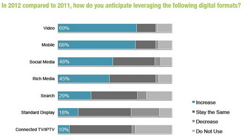 比較2011年和2012年奢侈品在各類數(shù)字媒體上的廣告投入側(cè)重,視頻、移動、社會化媒體以及富媒體占據(jù)了增長的最大比例。相反,搜索引擎、展示廣告以及電視媒體在投入增長上并不明顯。